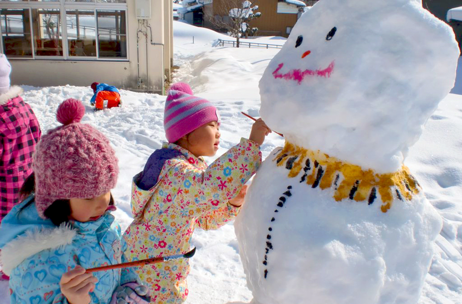 では実際の子育て現場の声はいかがでしょうか。信濃町には4つの保育園「柏原保育園」、「野尻保育園」、「富士里保育園」、「古間保育園」があります。この4ヶ所の保育園は待機児童がなく子育て環境も充実しています。今回は黒姫駅から徒歩3分程度のところにある「柏原保育園」を訪れ、先生方にお話を伺ってきました。広い園庭は一面の銀世界。子どもたちは自然いっぱいの環境で思いっきり遊ぶことができるなんて羨ましい限りです。