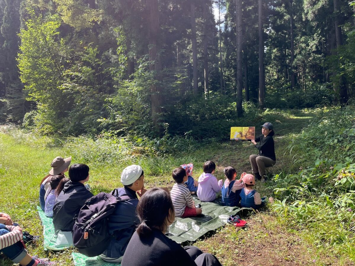 「別のプログラムで子ども達と森で過ごしていたときに、『三匹のくま』という絵本のさわりを読んでみたことがあります。そのとき、子ども達の顔つきがガラッと変わったのが印象的だったのです。 その絵本には杉林の絵が描かれていて、目の前の森の風景と絵本の絵が結びつきます。森の香り、川の流れる音、風の音。物語の世界がすぐそこにある。この臨場感を子どものときに感じるのはとても大事なことだと思いました」。